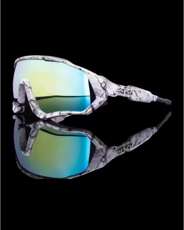Cycle glasses, with grey mottled frame and fluro lenses.